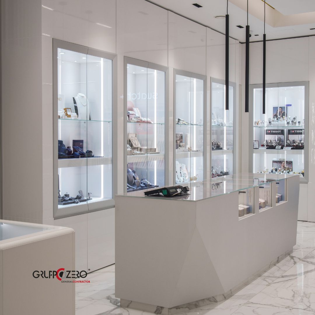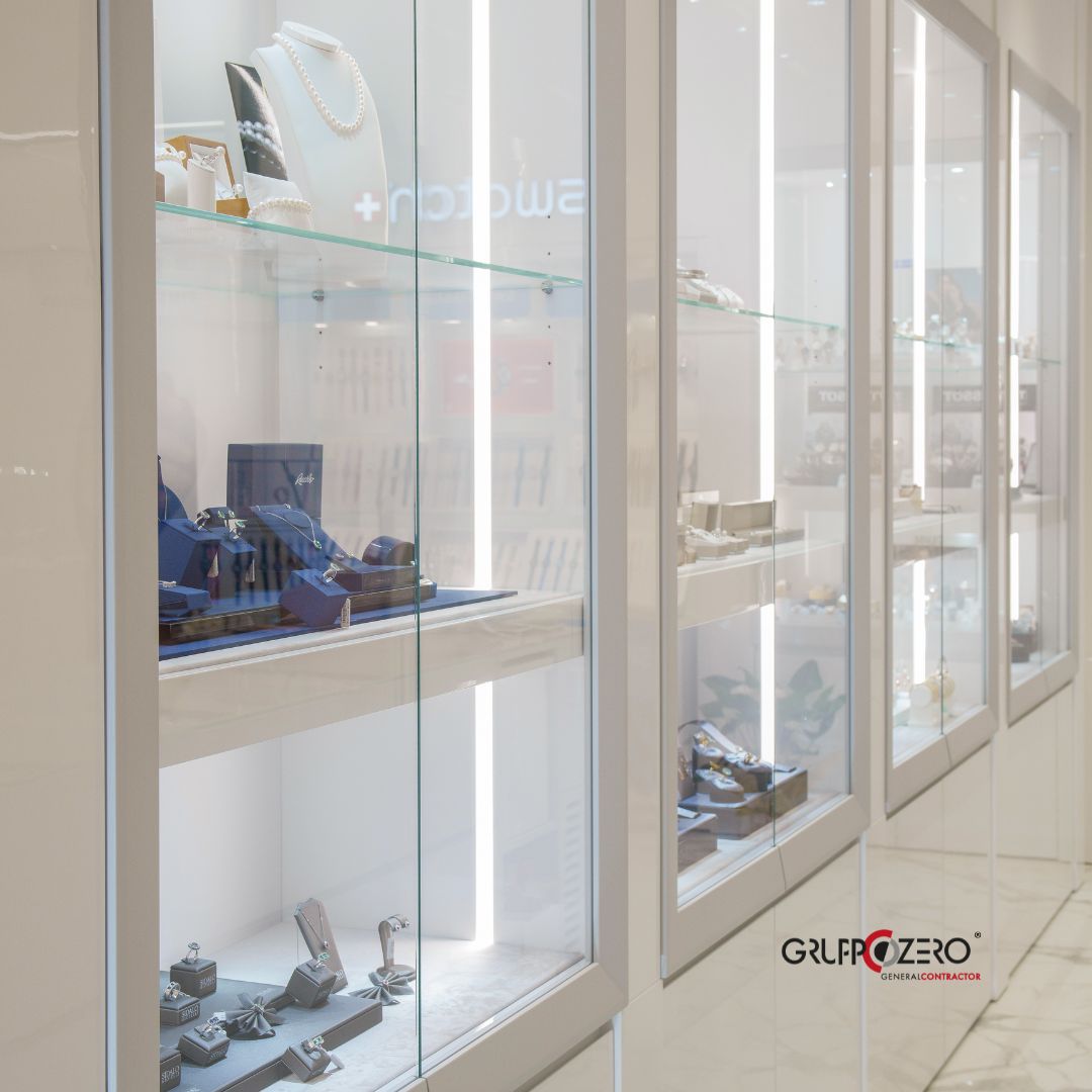Interventi realizzati: • Progettazione e arredi su misura • Studio illuminotecnico per valorizzare i prodotti esposti con il giusto bilanciamento cromatico • Selezione e integrazione di materiali pregiati • Realizzazione di ribassamenti in cartongesso e gole con illuminazione integrata • Installazione di impianti elettrici, idrici e di sicurezza