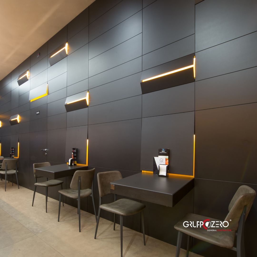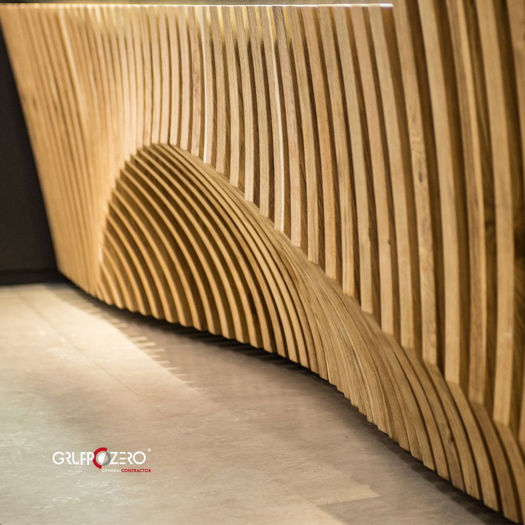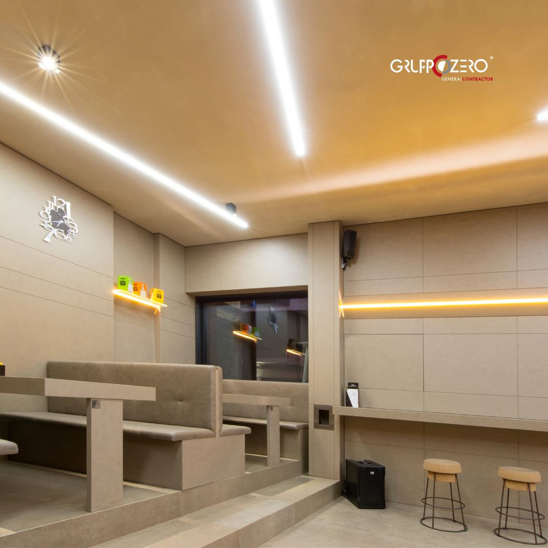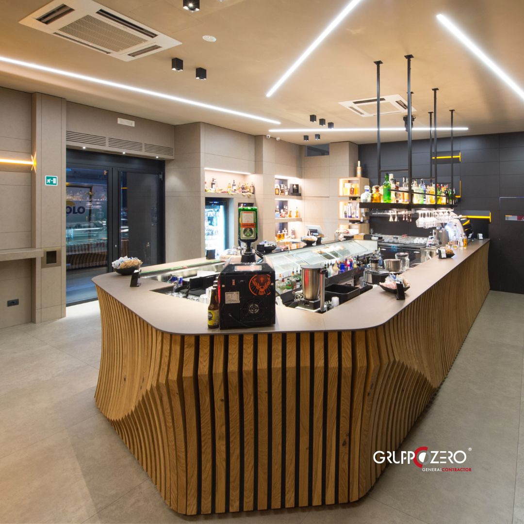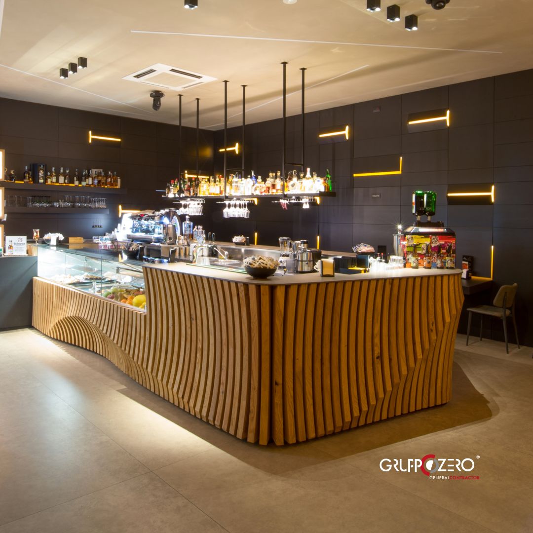 Tra i progetti della division ricettività, la realizzazione di Goha Food&Drink a Galatina ha rappresentato una bellissima riuscita in termini di atmosfera, resa stilistica e funzionalità. Il locale mescola colori, materiali e luci per restituire un ambiente confortevole e accogliente, di ispirazione cosmopolita, studiato anche per ospitare musica, gruppi e dj. A questo proposito è stato effettuato anche uno studio del sound e degli interventi specifici per l’insonorizzazione. Nel progetto, i controtelai in legno alle pareti – oltre a servire per l’insonorizzazione – contengono i punti luce, integrandoli in porzioni geometriche che danno profondità e dinamismo all’ambiente, caldo e contemporaneo. Quando si parla di attività ricettive e ristorative, l’ambiente, le luci e le tonalità del progetto devono rispecchiare l’idea imprenditoriale e la sua essenza, senza però dimenticare la funzionalità degli spazi, sia per l’accoglienza che per il lavoro. Il cuore del locale è un grande bancone a isola, studiato per dare dinamismo e calore grazie alle forme morbide e al legno scolpito che lo definisce: una composizione fluida e armonica come la musica.